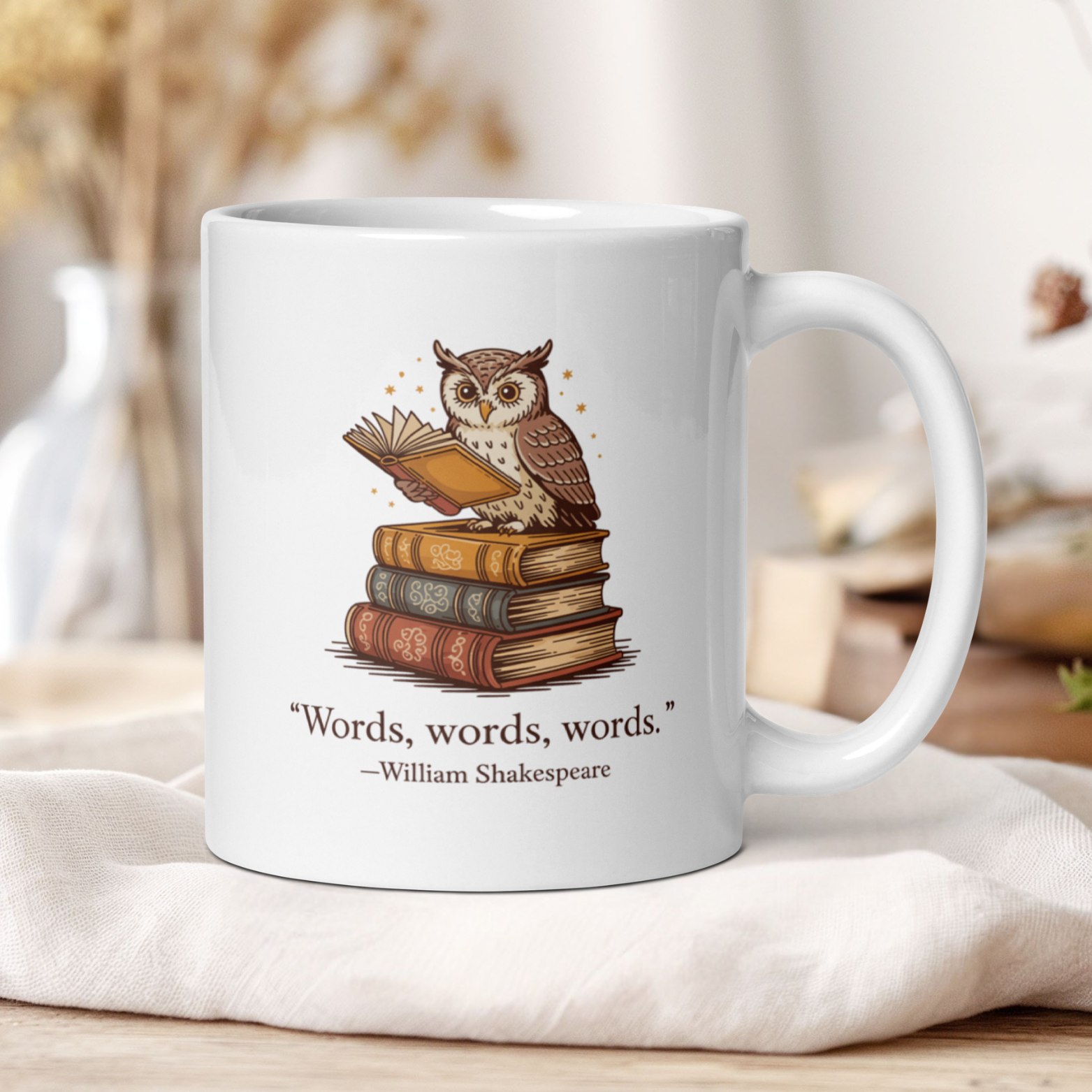 This William Shakespeare quote mug blends classic literature with charming bookish imagery.